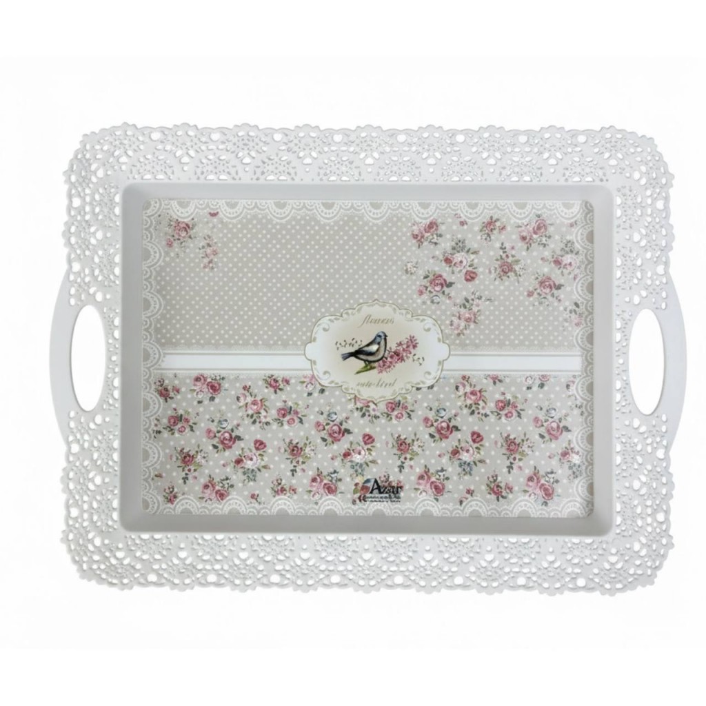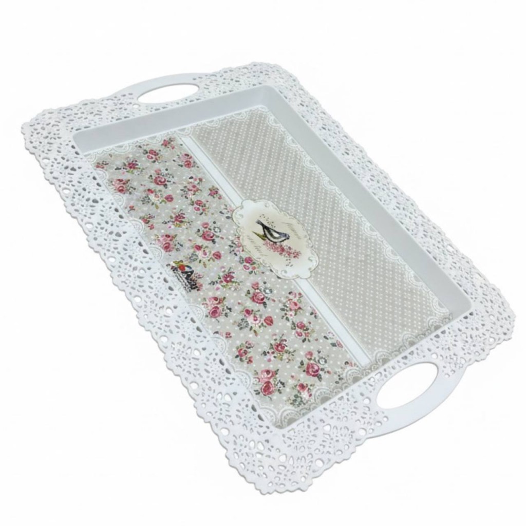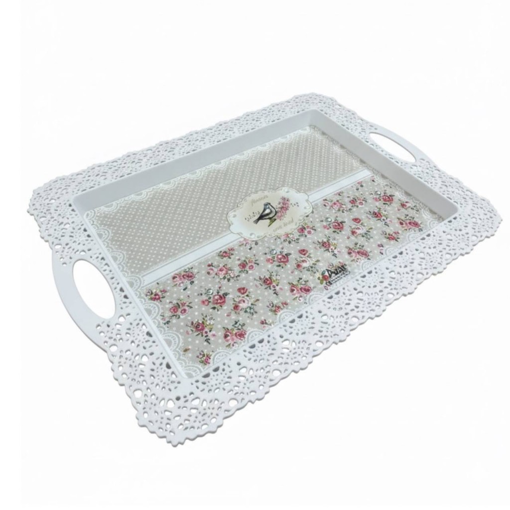 سینی مستطیل دانتل شماره ۲ رزگلد با دست گیره های یک سره و پس زمینه گل های رنگی مناسب برای انواع آشپزخانه ها و پذیرایی ها هستش و دور تا دور سینی به خصوص روی دستگیره ها با طراحی پنجره ای شکل طراحی شده برای کاربرد و راحتی بیشتر تا در صورت عدم استفاده از دستگیره ها باز هم استفاده از سینی به راحتی امکان پذیر باشد